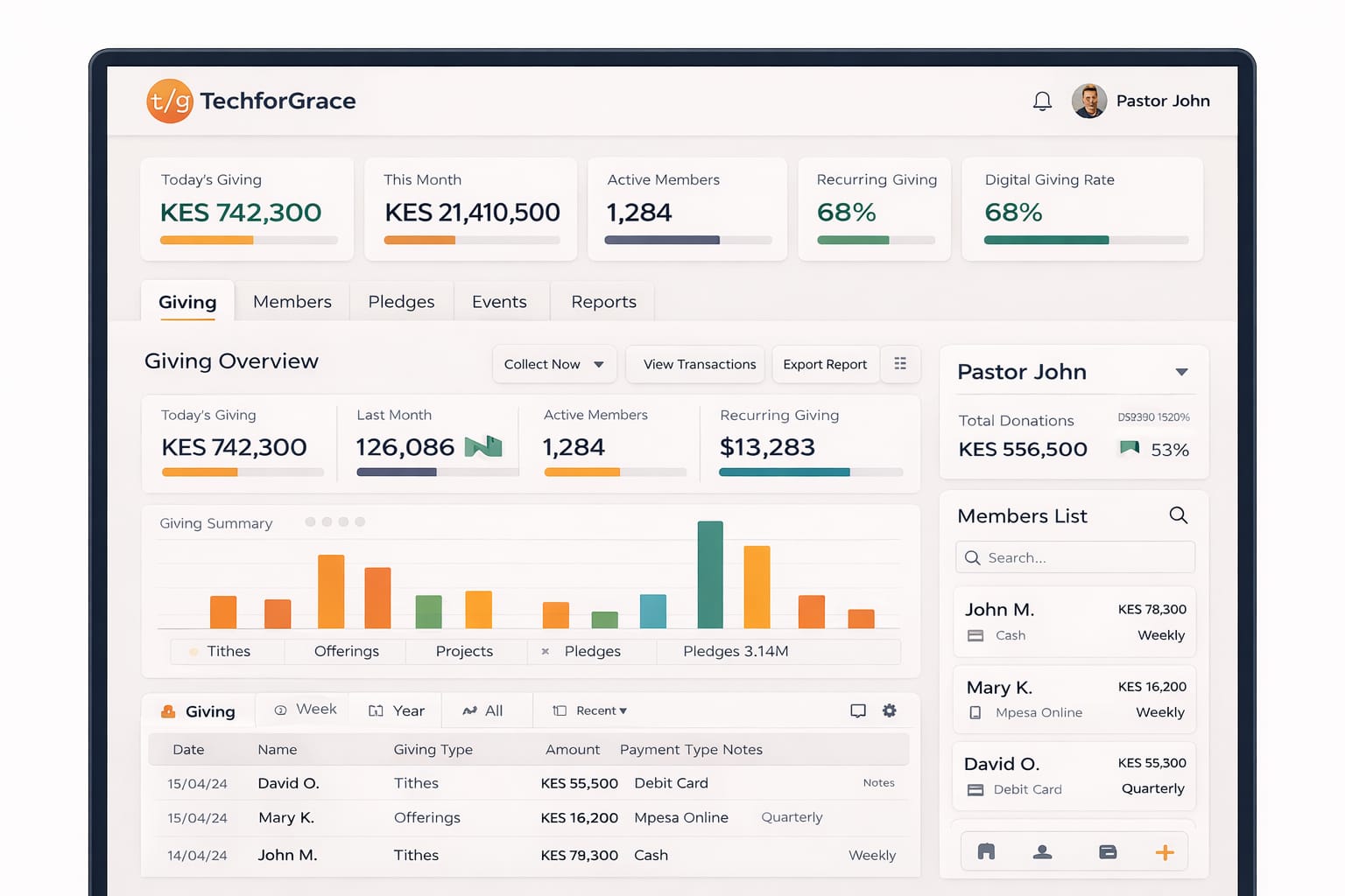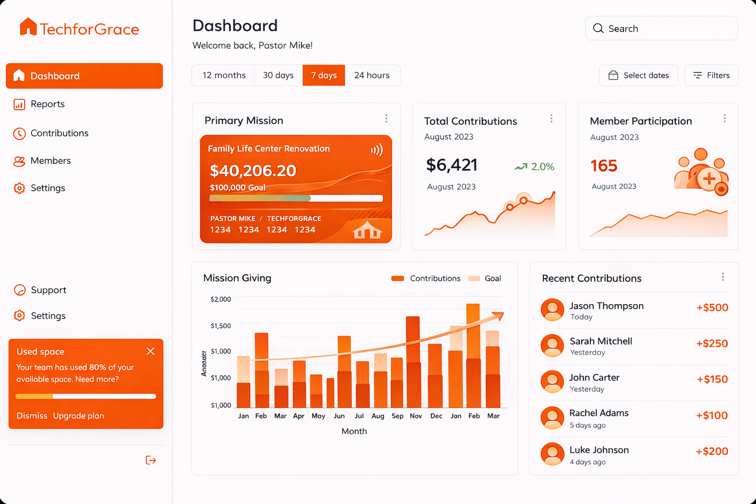 Welcome to TechforGrace, where ministry meets technology. Our platform is dedicated to helping churches simplify giving, manage campaigns, and complete their missions with ease.